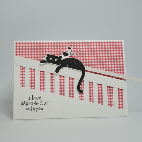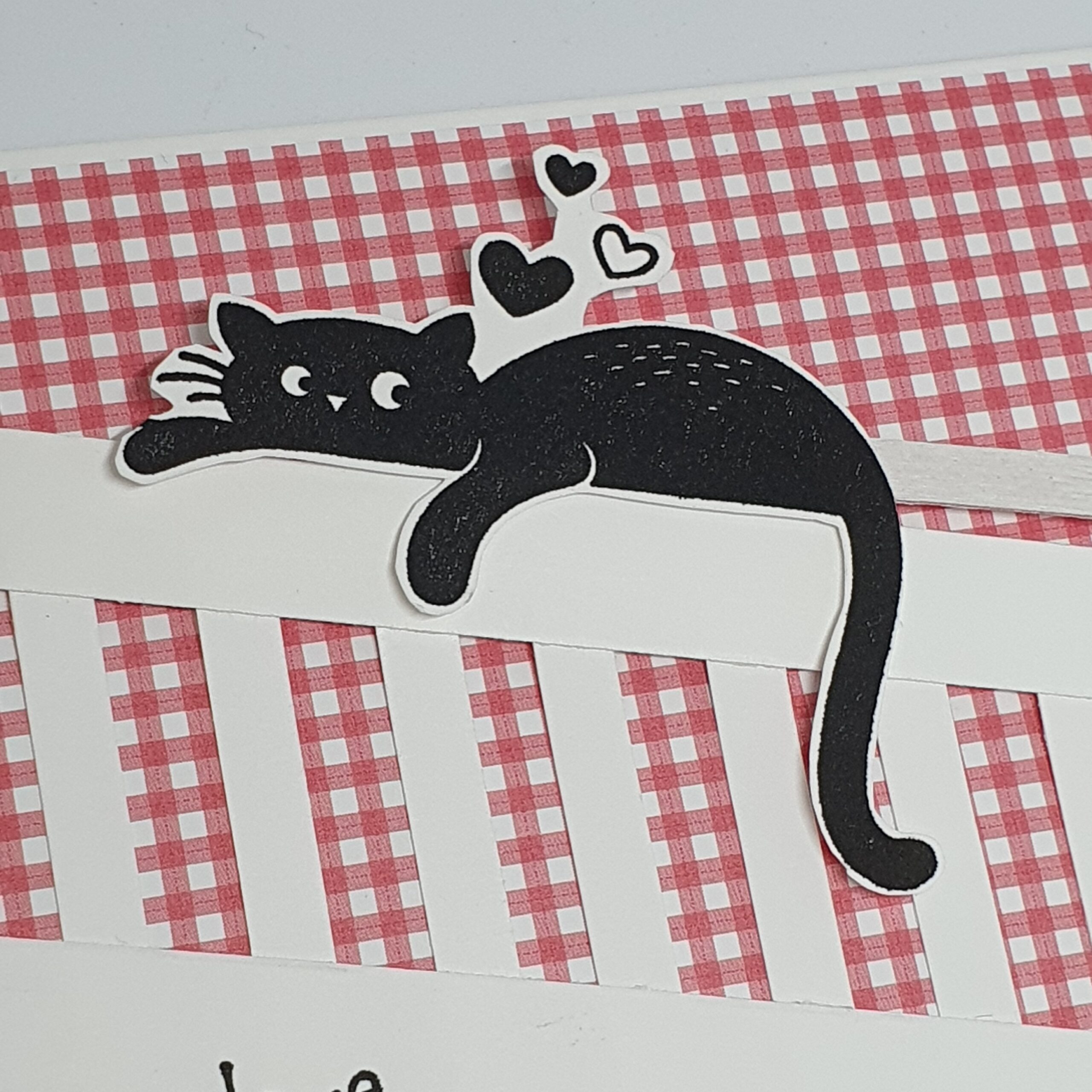 Ik heb gekozen om met de stempelset Love Cats te werken. Deze katten zijn zo geweldig leuk! In het echt vind ik hun nagels niet fijn en laten ze nou net altijd mijn benen opzoeken om ze erin te zetten… Let wel: ik vind katten leuk om te zien, maar hier in huis loopt al een hond, en die is niet altijd gek op katten in de buurt.