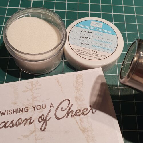Om te beginnen zijn de teksten ge-heatembosst, en ook de arrenslee. Vooral voor de arrenslee komt dit mooi uit: het is in Early Espresso dus dat werkt dan makkelijker als die kleur ge”seald” is met Clear embossingpoeder. Want ik wilde met een waterverfpenseel de kleuren opzetten.