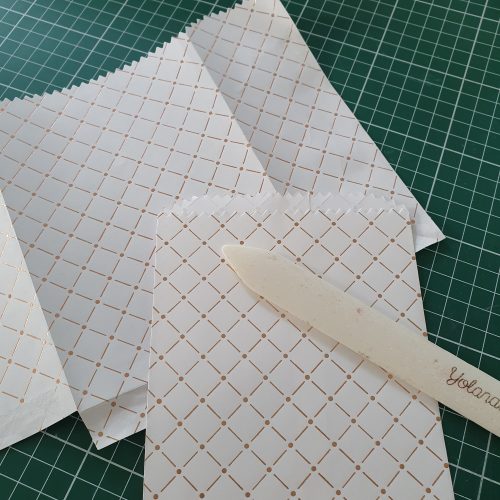 Ik heb voor de versiering van de Kraft Pillow Box EN de Mini Pizza Box een zakje helemaal los gepeuterd en netjes versneden tot maten die precies passen: een reep van 2 inch voor om de Kraft Pillow Box. En van het restant heb ik stukjes gesneden om de Mini Pizza Box mee te beplakken.