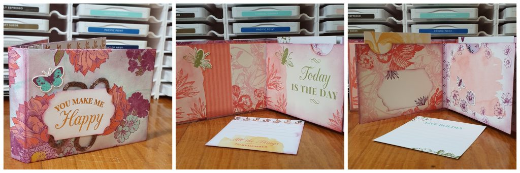 En zo bedacht ik voor deze bloghop een mini-album. De buiten-en binnenzijde is bekleed met het prachtige papier. De kleine kaartjes heb ik gebruikt voor in de binnenzijde. Daarmee zijn pockets gevormd door ze aan een rug aan elkaar te lijmen met een superdun lijntje Tombow-lijm, jullie weten dat dat mijn favoriete lijm is!