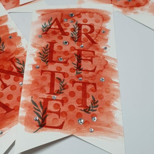 Hiervoor heb ik label gesneden/geknipt, in verschillende lagen ge-washed met een aquapainter en Calypso Coral inkt. Na droging heb ik met een (retired) sjabloon en een brushkwast en dezelfde inkt de stippen erop gemaakt. Daarna ook weer met de Calypso Coral de “Classic Letters” van de namen gestempeld.