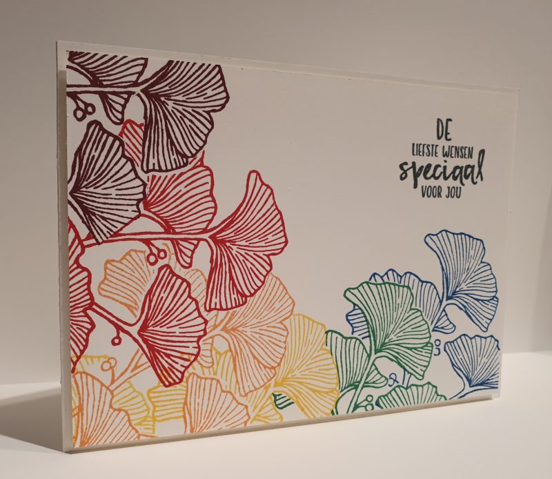 Ik heb van de bladeren eerst een masker gemaakt van een velletje Post-It papier, en dat precies langs de randen uitgeknipt. Als je dat over een gestempelde afbeelding plakt, kun je “achter” de stempel stempelen. Het is wel een beetje een precies werkje, maar okee, daar neem ik graag de tijd voor. Ik was immers bezig met een rustgevende stempel, toch?