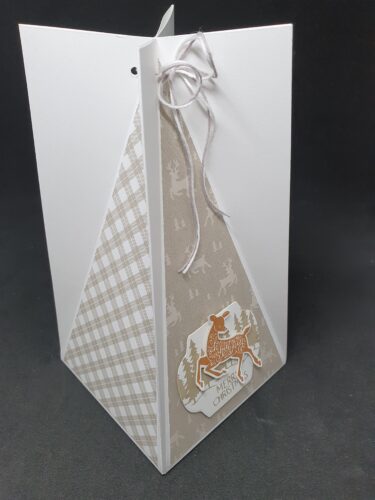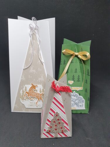 Eigenlijk zijn het gewoon vierkante dozen, waarvan de top in het midden van elk vlak ligt. Dat vouw je naar buiten toe, zet gaatjes in de top (net langs de vouwrand) waar je een mooi lint doorheen voert. Doe dat vooral NADAT je de vulling erin gedaan hebt…. En klaar is de vierkante driehoeksdoos.