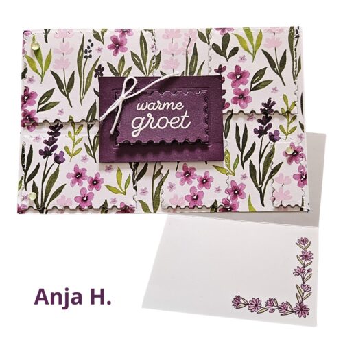 Natuurlijk ging ik graag aan de slag hiermee. Pakte mijn stempelset erbij en maakt een kaart met een pocket. Op het Basic White papier stempelde ik een rijtje van die prachtige bloemen. En omdat het DSP dubbelzijdig bedrukt, kun je het ook goed keren. Soms vraag ik mij af welke kant nu de voorkant is…