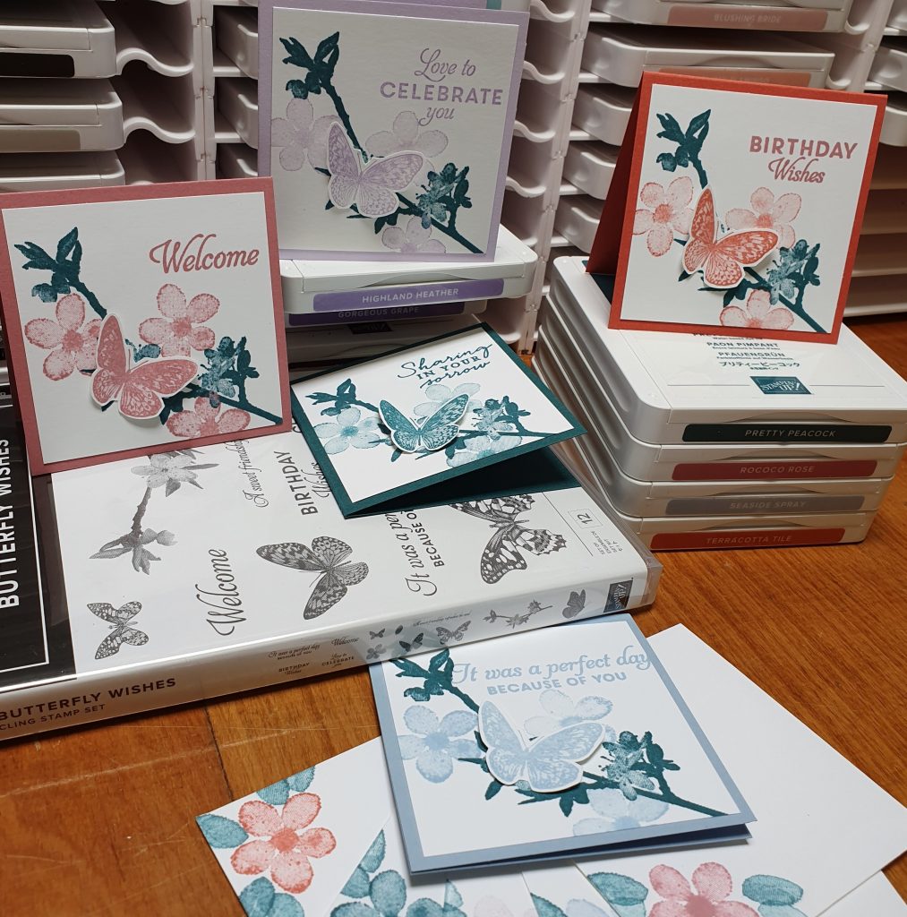 Voor je zie je een groep kaartjes waarin om de beurt een andere van de In Colors is gebruikt, met als basiskleur het mooie pauwblauw: Pretty Peacock. De maten van de kaartjes zijn aangepast aan de leuke 3″x 3″ envelopjes uit ons assortiment. Ook deze zijn bijpassend bestempeld.