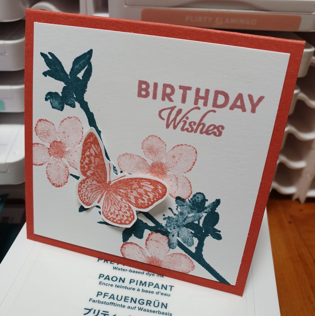 Het stempelen is niet moeilijk te noemen. De tak wordt gestempeld, en de bloemetjes worden beïnkt en 1x afgestempeld op een kladpapiertje. Zo wordt de inkt iets zachter qua uiterlijk. Niet voor elke kleur is dat nodig, maar het subtiele staat ook erg mooi. De vlinders zijn met de hand uitgeknipt met een heel scherp schaartje: de Paper Snips. Heb jij die al in je etui?