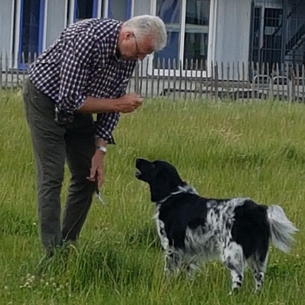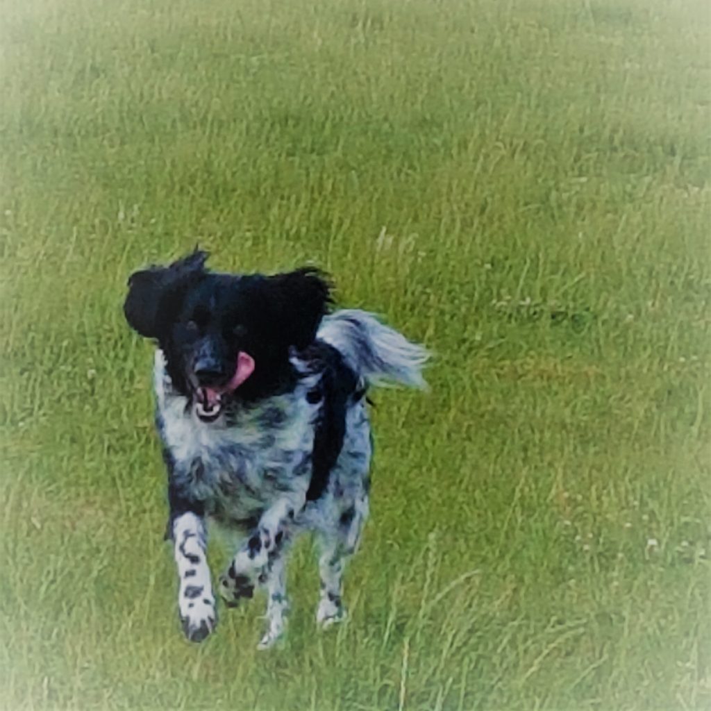 Natuurlijk omdat wij zelf een heel lieve en toch soms ondeugende en rare hond (Simba/of liever Siebe…) hebben: een Friese Stabij, wit met zwarte platen. En met een machtig mooie staart, die pluim veert zo parmantig mee als hij loopt. En die staart kan ook zo blij kwispelen als hij ons ziet. Hij heeft echt een Happy Tail!