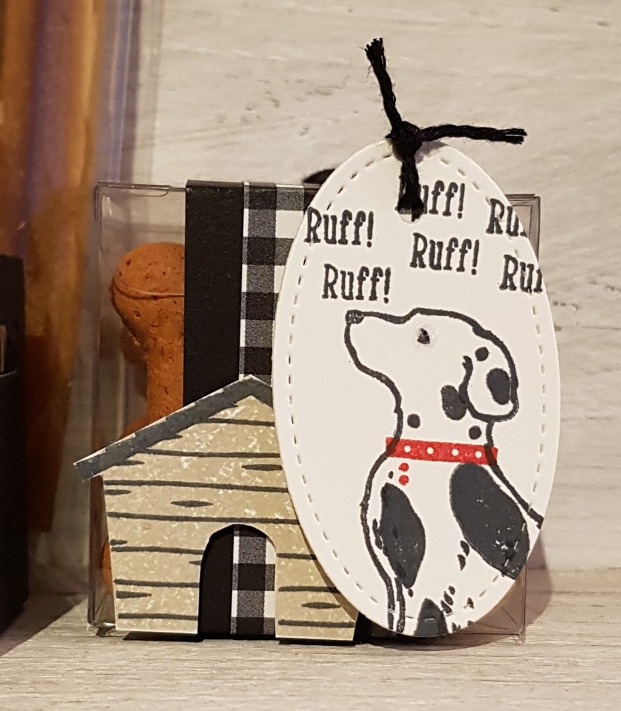 Als derde kadootje heb ik een doorzichtig plastic doosje gebruikt (ook uit ons assortiment…). Hier omheen heb ik een strip cardstock geplakt, vervolgens een strip DSP ruitjespapier en dat omwikkeld met zwart twinedraad. Hieraan hangt een ovalen label waarop de hond slechts voor een deel gestempeld werd. Het oogje is extra uitgelicht door een drupje Fine-tip Glue erop te zetten.
