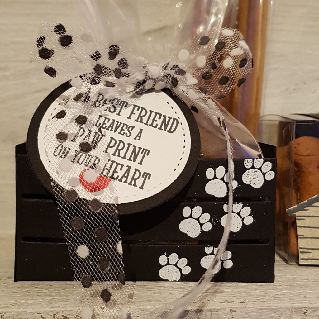 Voor het zakje met voertjes heb ik een kratje uit zwart cardstock gestanst, en dat bewerkt met de pootafdrukjes – die zijn wit ge-heat-embost. Aan het zakje een lint gebonden. Nu is dat lint (Polka Dot Tule) wit gestipt. En we hebben de Blends. De alcoholinkt zorgt ervoor dat het makkelijk en snel droogt. Ik heb willekeurig groepjes zwarte stippen gemaakt. Het tule blijft daardoor wit, wat het zwart-wit gevlekte leuk nabootst. En het staat ook zo grappig. De tekst spreekt voor zich en het is echt waar. Simba is onze derde stabij, toch weer heel anders dan de vorige twee honden.