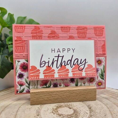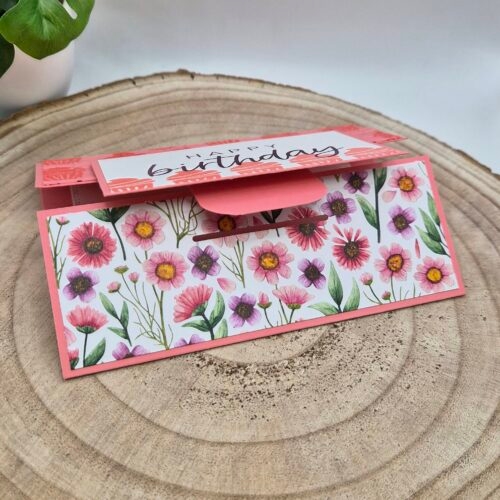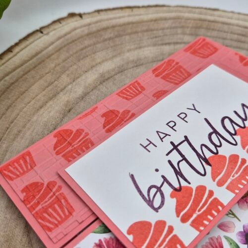 Op de bovenste flap zit een stuk kaartkarton in dezelfde kleur als de kaartbasis. Dat heb ik bestempeld met dezelfde kleur inkt: Flirty Flamingo. Door hierbij een diagonaal aflopend patroon aan te houden oogt het speels.