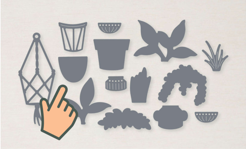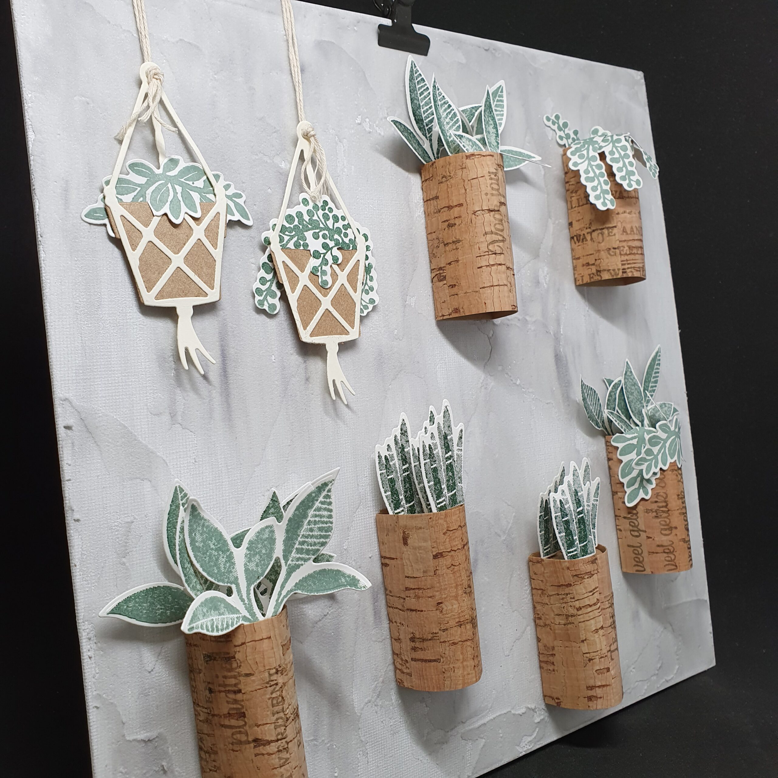 En de potjes heb ik gemaakt van een strookje kurkpapier. Om het aan de “muur” te bevestigen zorgde ik dat de achterkant plat was. De vorm van de doorsnede van het “potje” vond ik in de pot-stans die in de snijmallenset zit: