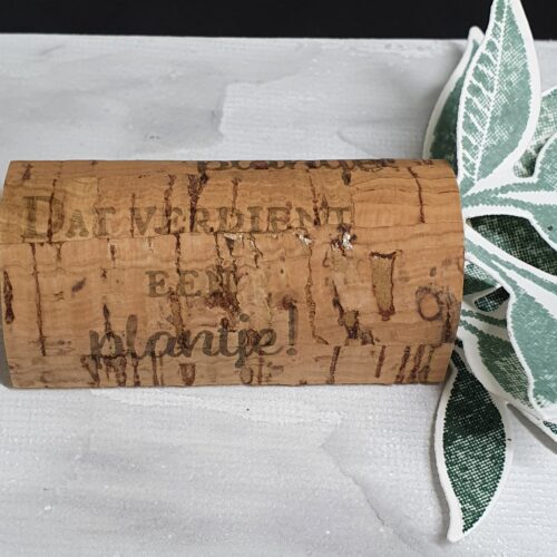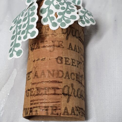 Vóórdat ik de potjes in elkaar zette, heb ik met de tekststempeltjes uit de stempelset “Plantenpost” gestempeld met Smoky Slate stempelinkt op het kurk. Dat ging verbazingwekkend goed! Het heeft zo echt het uiterlijk zoals een wijnkurk dat kan hebben.