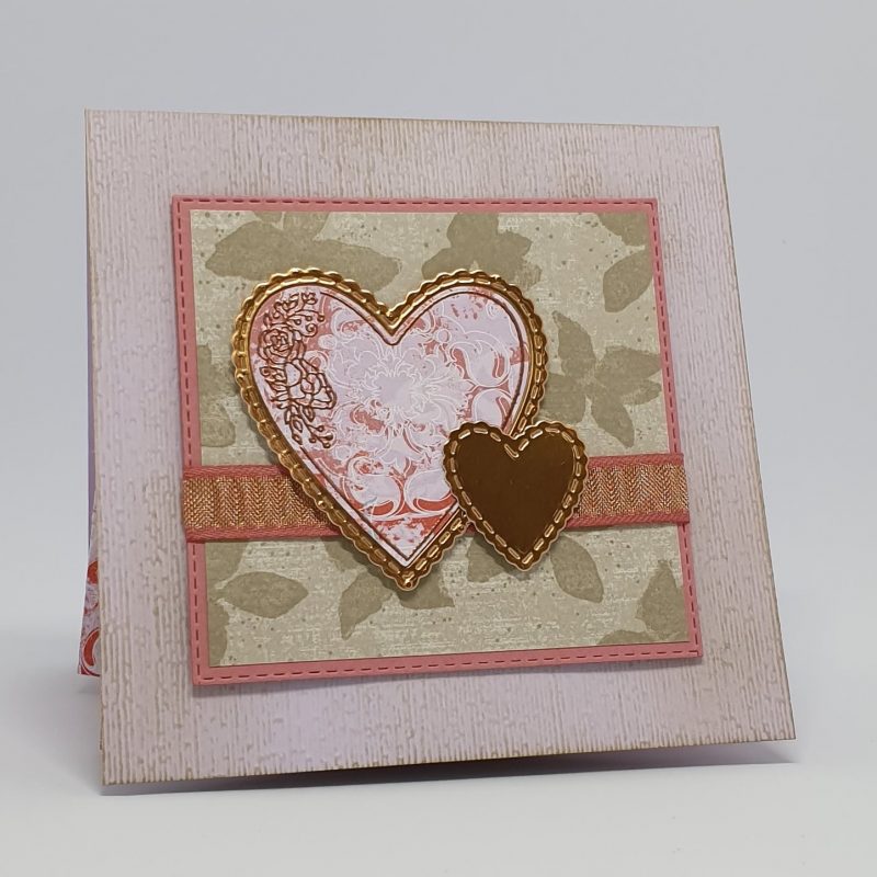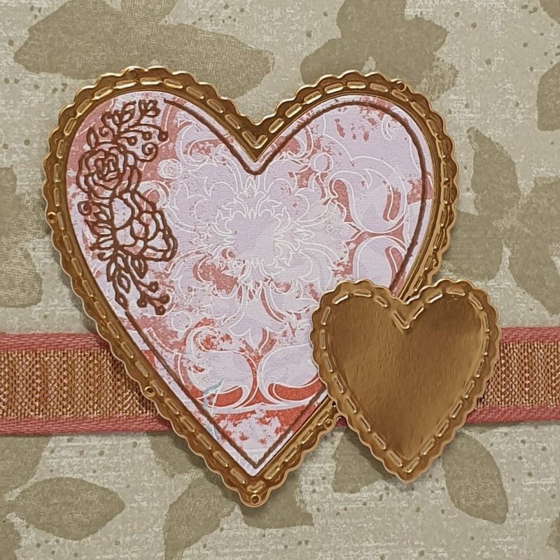 Voor het hart heb ik een combinatie gebruikt van koper: embossingpoeder, foil sheet, en DSP. Verhoogd opgeplakt met Dimensionals. De harten vind je terug in “Meant to Be stempelset” en “Stitched be Mine Dies”.