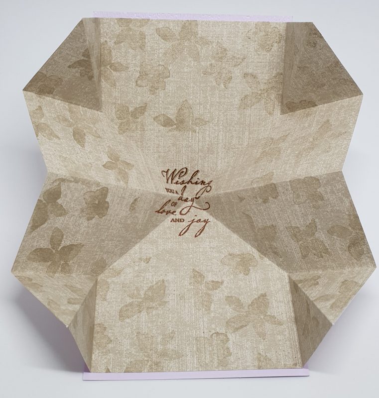 Zodra je de kaart openvouwt, zie je hoe de binnenkant is gevouwen en ik heb het bestempeld in “second generation”-techniek. Daarvoor stempel je eerst je stempel af op een kladje en wordt de afdruk iets subtieler. Vergelijk het maar met de voorzijde, daarop heb ik de stempels direct afgedrukt.
