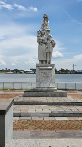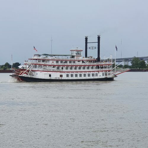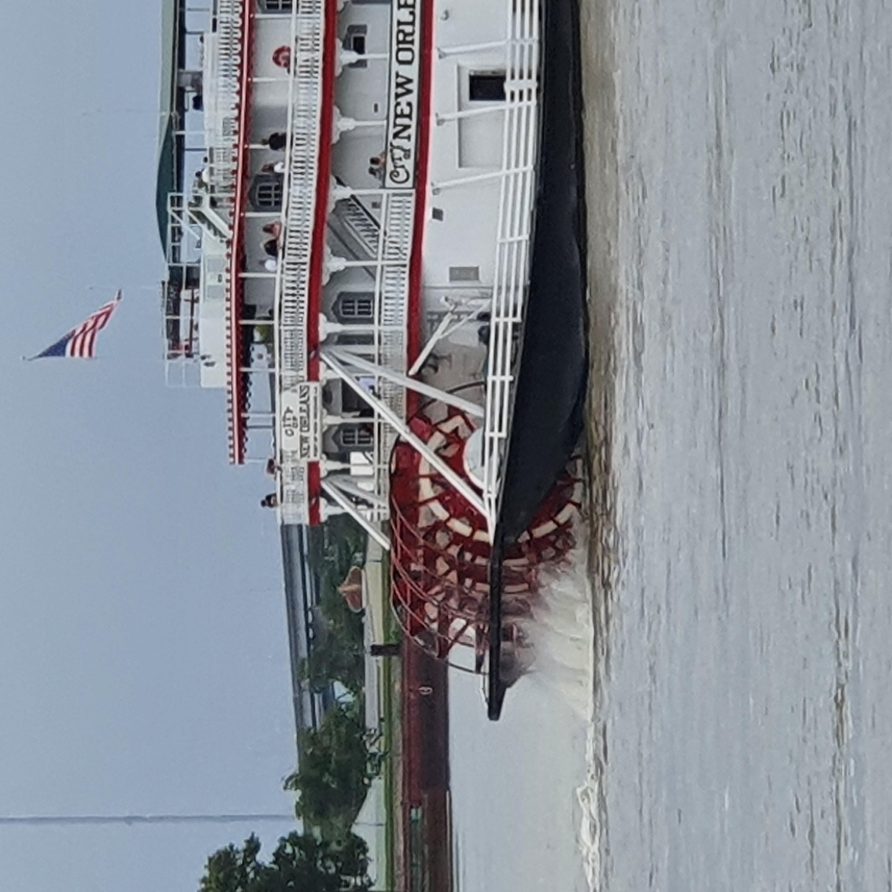 Daarna verder gewandeld naar de rivier Mississippi, op zoek naar een mooi wandelgebied: een groen graspark met een soort van beeldenroute. Onderweg dat we langs de kade liepen kwam er juist een raderboot aan/voorbij. Machtig leuk om te zien!