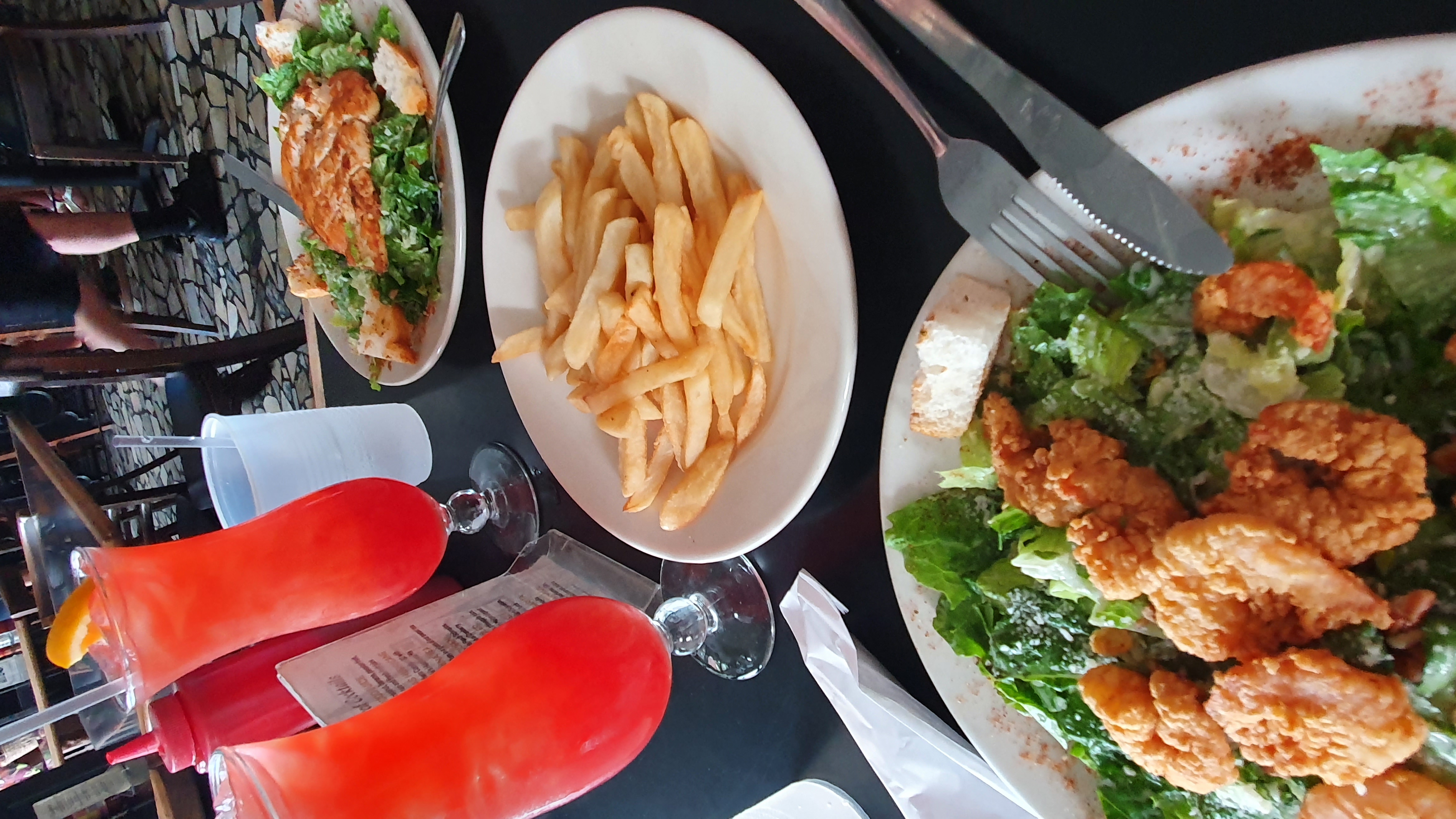 De maaltijd was heerlijk: ik had een Creoolse salade met gebakken garnalen, Ellen een zelfde salade met gegrilde kipfilet. En frietjes! Smullen!