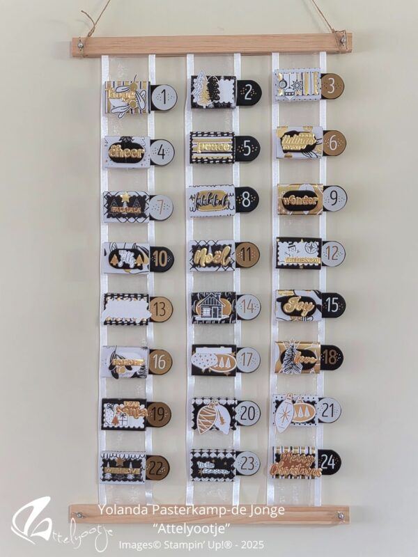 Er werd gewerkt aan een Adventskalender. Luciferdoosjes (ik had gespaard, niet hoor: gewoon gekocht bij een groothandel in Duitsland). 24 Stuks werden bekleed met het mooie Speciaal Designer Papier “Modern Christmas” en verder versierd met teksten die met de Hybride Embossingfolder/Stans waren gemaakt in de Stansmachine. Ook de tussenliggende laagjes zijn gestanste of geknipte / gestempelde afbeeldingen / vormen. De Volop-Post stansen waren daarbij erg in trek. En ja wat wil je: zwart-wit-goud zijn superfeestelijke combinaties kleuren!