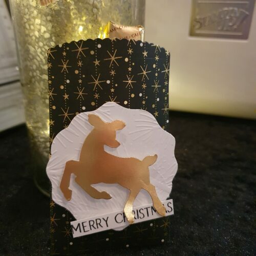 Het sierlijke hert (“HERTVORMENPONS” (156390) is geponst uit “GOUDEN FOLIEVELLEN” (132622) en opgeplakt met behulp van Dimensionals (104430).