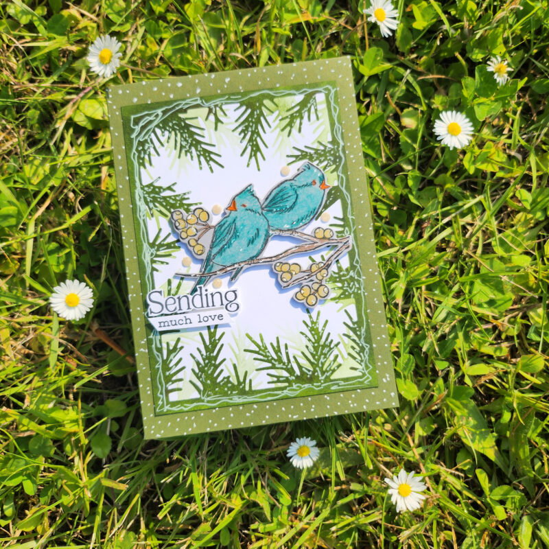 Deze kaart was één van de kaarten die wij konden maken met het online Stampin’ Up!-evenement Creativity Now, afgelopen zaterdag. De takjes achtergrond is gedaan met een Blending borstel. Ik heb er mijn touch aan toegevoegd door sneeuwstipjes met witte gelpen (uit mij privé collectie) op de rand en hier en daar op de vogeltjes en takjes te plaatsen. Ook de randen met de witte gelpen bewerkt.