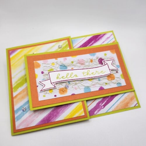 Tijdens OnStage ontvingen wij een pakje Memories&More kaartjes, waarmee je tijdens de pauzes/creatieve avond kon werken. Ik vind de kleurtjes zo ontzetten leuk en vrolijk, dat ik ze voor deze kaart gebruikte.