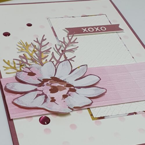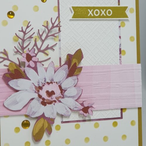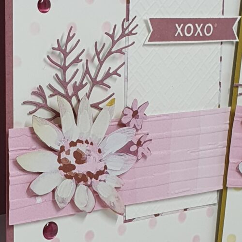 De takjes zijn gestanst uit kaartkarton en achter de bloemen geplakt. Om hoogte te geven zijn de bloemen met Dimensionals opgeplakt.