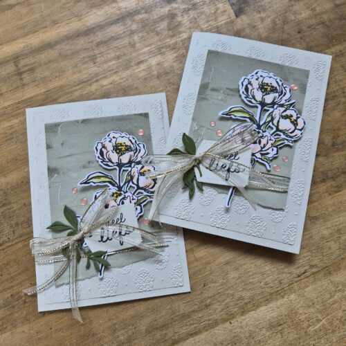 Er is gewerkt met de prachtige tekstloze stempelsetbundel (of deel van het collectiepakket) Gallery Blooms (165211). Alle delen van dit pakket zijn ook afzonderlijk verkrijgbaar, de stempelsets-met-stansen zelfs als bundel, met korting.