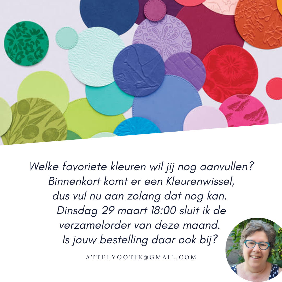 Met de nieuwe catalogus in het zicht, gaat er ook snel (!) een uitverkoop plaatsvinden: sommige artikelen gaan met korting weg. Zo ook cardstock, inkt, markers, Blends (alcohol stiften) – kortom alles wat met de kleurenwissel te maken heeft gaat “op de schop”. En dan geldt: zolang de voorraad strekt.