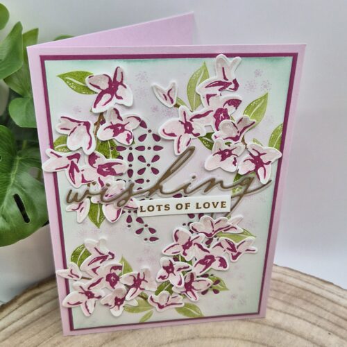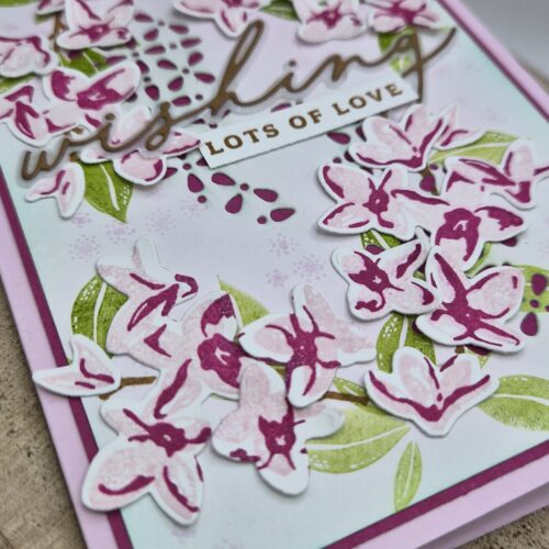 Voor de basis van de bloemen stempelde ik met Bubble Bath. Lekker fris kleurtje roze.