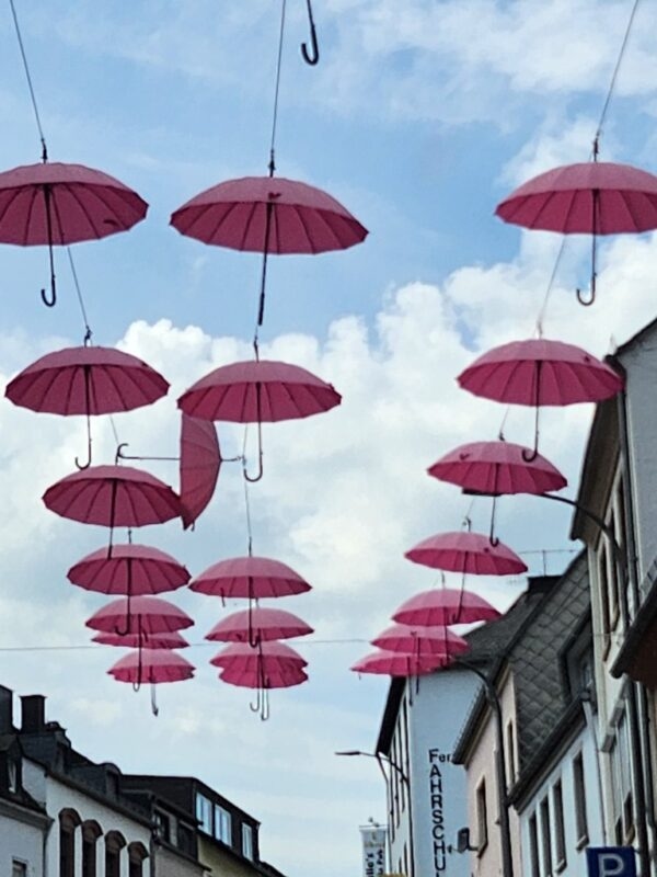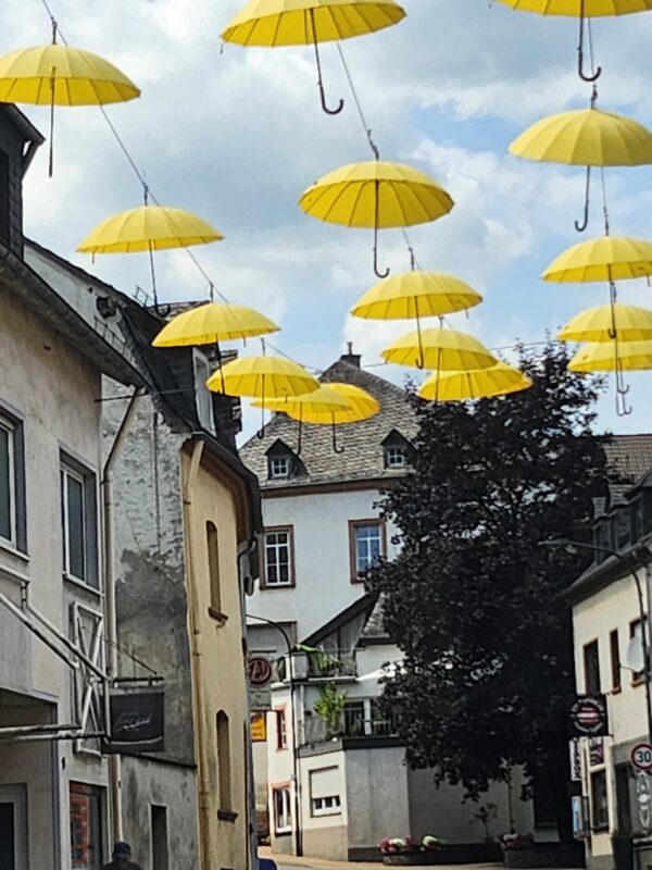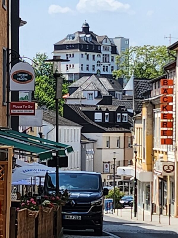 Wat volgden waren heerlijke dagen, volop genieten van het gezelschap, de omgeving, heerlijk eten. En het weer: de zaterdag was smoorheet, lekker om in de auto te rijden, met de airco aan. We hebben het plaatsje Gerolstein bezocht wat ons aangeraden was, je kon er leuk winkelen. Maar: op zaterdagmiddag om half één gaan eten, dan een uur zitten, dan zijn daarna de winkels zowat dicht…. was niet zo handig, maar we hadden toch heerlijk gegeten. Daarom toch maar weer in de auto gestapt vanwege de airco, en doorgereden naar Prüm. Een ontzettend leuk plaatsje om te zien, vooral de versierde straten. Hier zijn we niet eens uitgestapt: het was verder ook uitgestorven leek het. Maar het was een mooie tocht met bochten, bergje op-bergje af… We kwam nog in een file terecht: door tractoren (we hebben niet geteld, maar schatten het er zo’n twintig, werden caravans, vouwwagens, vouwcaravans getrokken. Werden zeker verplaatst naar een andere camping?? Het hield het verkeer danig op, maar was wel komisch. Steeds als we er eentje uiteindelijk konden passeren, kwam de volgende ineens in zicht.