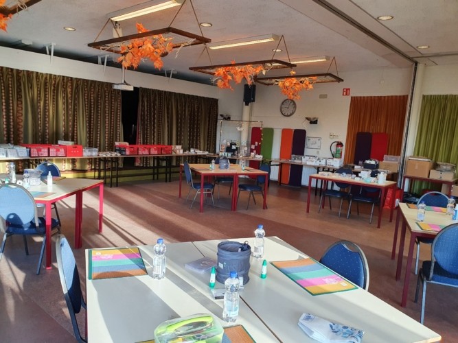 Eerst nog even een rit heen en terug naar het ziekenhuis. En toen reden we vrijdag naar het gebouw waar de workshopdag werd gehouden. Het plaatsen en inrichten ging allemaal lekker vlot.
