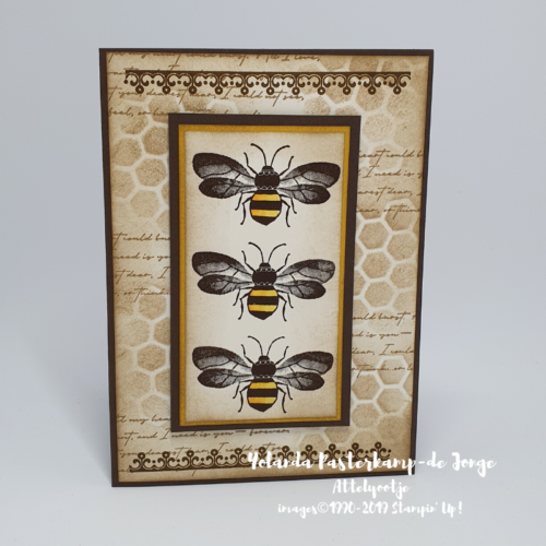 De bijen lenen zich uitstekend om een vintage-achtige kaart te maken, vooral de bruine kleuren passen prima met het geel van de bijen.