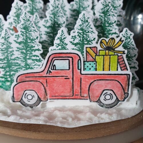 De Truck heb ik eerst gestempeld met zwarte Memento inkt, gecombineerd met Versamark: zo kon ik het meteen heat-embossen met Clear Embossingpoeder. Gaat echt goed, probeer het ook maar een keer. Met alle kleuren mogelijk! (Nu denk ik: waarom eigenlijk niet met zwart poeder gewerkt? Omdat ik graag moeilijk doe als het ook makkelijk kan hahaha. Nee ik had inkleuren in mijn hoofd maar bedacht dat watermiddelen dan niet goed werken, het zwart poetst uit en het kleurwerk wordt “smerig” wat natuurlijk niet “kan”, dus een laagje embossingpoeder in Clear verhindert het doorkleuren. En daarnaast: heat-embossing in nu eenmaal mijn first love technique in stamping).