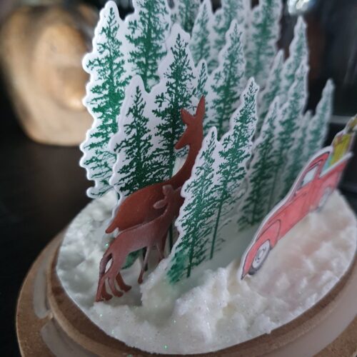 Het bos heb ik in Shaded Spruce (het “échte” dennengroen!) gestempeld met behulp van een stempel uit de set “Grassy Grove”, heel handig is dan ook de bijpassende snijmal. Voor de achterste rij heb ik de stammen laten zitten, maar voor de middelste rij heb ik ze “afgehakt” (lees: geknipt), en voor de voorste rij heb ik ze nog iets korter geknipt, dat alles met het handige Paper Snips schaartje. Superscherp EN precies.