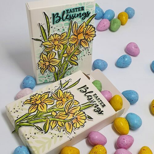 De grote narcis heb ik toegevoegd aan het boeketje met de drie bloemen. De achtergrond is geborsteld met inkt en de gezellige maskers. Heb het maar fijntjes gehouden, de doosjes hebben bijna het formaat van speelkaarten.