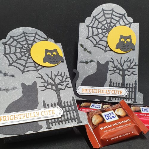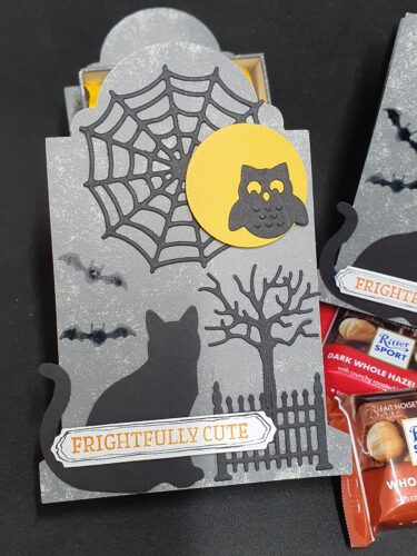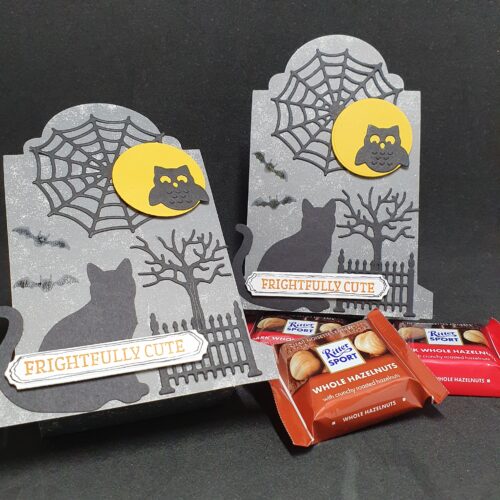 Voor de versiering van deze grafsteendoosjes (brrr ook al zo griezelig…) gebruikte ik voornamelijk stansen, omdat het zwarte cardstock zich daarvoor prima leent. Een nacht-tafereel. De kat jengelt in de nacht om een vriendje en de uil denkt er het zijne van…. Eigenlijk denktie: je bent Vreselijk Lief! / Frightfully Cute.
