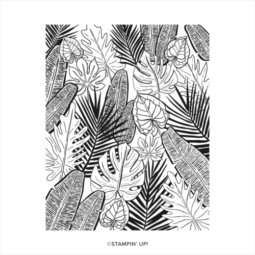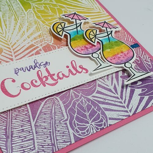 Er is een mooie achtergrondstempel waaraan ik meteen dacht: de “Tropical Hideaway: – deze prachtige achtergrond is voor veel doeleinden inzetbaar. En ja… als je van heatembossing houdt… dan maak je eerst een mooie regenboogachtergrond met inkt en Blender Borstels, om daarna met wit embossingpoeder te heatembossen.