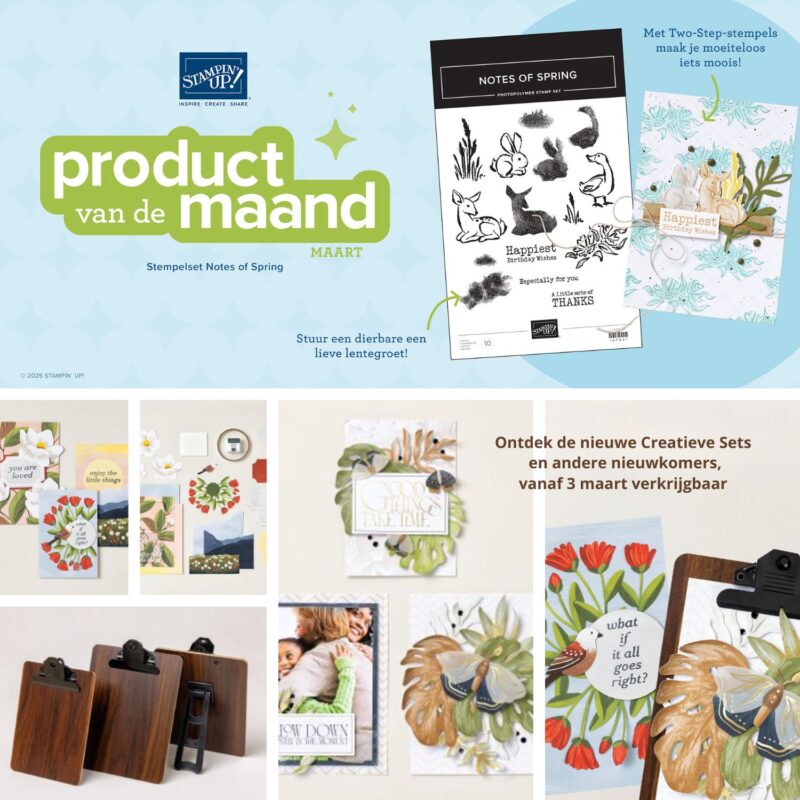 Het Product van de Maand is een prachtig getekende stempelset, met daarin een paar kleinere teksten. Heel goed bruikbaar voor allerlei groeten. Je kan bijvoorbeeld ook op DSP stempelen, deed je dat al eens? Hier zijn de natuur-afbeeldingen heel goed te combineren.