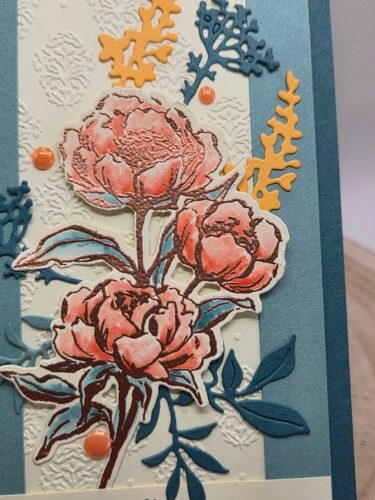 Van een paar rest-stukjes kaartkarton (Peach Pie, Lost Lagoon en Pretty Peacock) stanste ik de bloemetjes en blaadjes die achter de bloem schuilgaan.