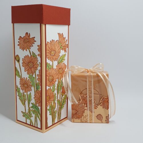Ik heb er mijn draai (en andere maten) aan gegeven door de stempel niet op het doosje zelf te zetten maar op Basic White papier, wat ik daarna inkleurde. De blaadjes enn de bloemen met een Water Painter en inkt, de hartjes van de bloemen met een (droog) Daffodil Delight (geel) Water Color Pencil.