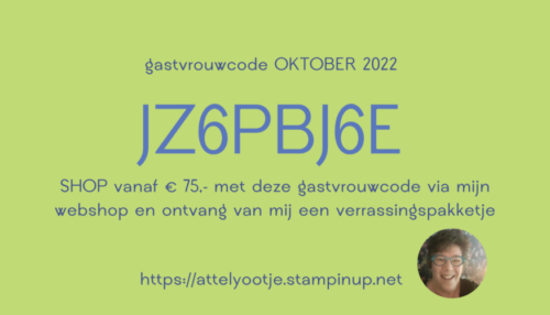 Is je bestelling meer dan € 75,- vergeet dan niet de gastvrouwcode van deze maand te vermelden: JZ6PBJ6E en je ontvangt van mij een verrassingspakketje via de post.