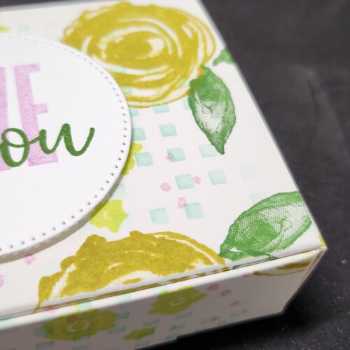 Daarover heen heb ik met de kleine bloem (in Wild Wheat) gestempeld, de blaadjes in Garden Green. Hier en daar met ook een lichte kleur (Fresh Freesia) de stippeltjesstempel geplaatst en tussendoor nog het stempeltje met de drie kleinere bloemetjes, in Lemon Lime Twist.