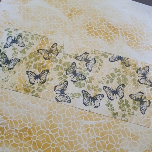 De groene achtergrond is in smack-down techniek gedaan: hierbij klop je met je beïnkte stempel als het ware in snelle bewegingen de stempelinkt op het papier (hier heb ik waaierbewegingen gemaakt).