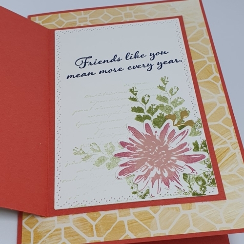 Voor de bloem en de varen heb ik in 2 kleuren beïnkt: eerst een lichte kleur, daarna voorzichtig met een donkerder inktkussen langs de randen gedept, en daarna gestempeld. Dit geeft een mooi effect he?