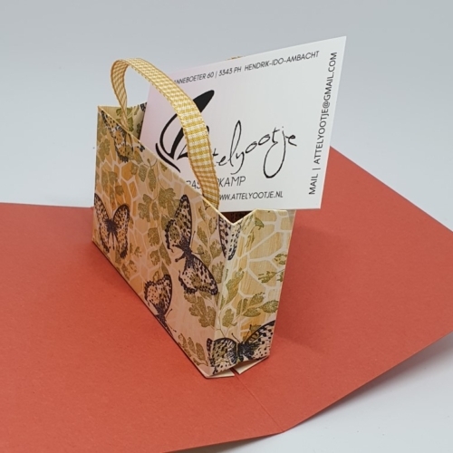 Het is altijd weer een feestje om een kaart als deze te maken: het is dan ook voor een feestje. Een kadokaart kan in een boodschappentasje gestoken worden voor felicitatie.