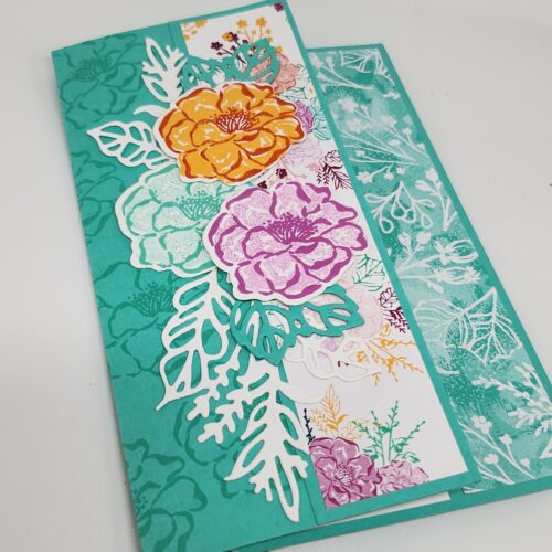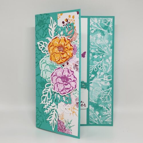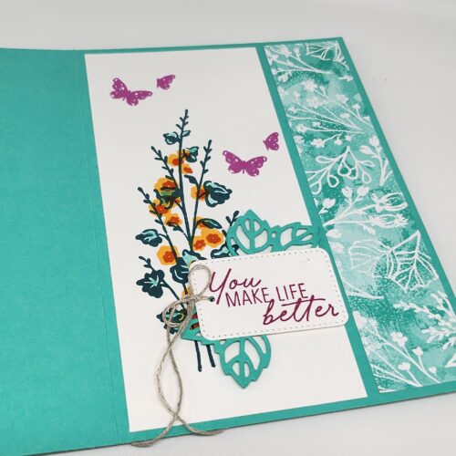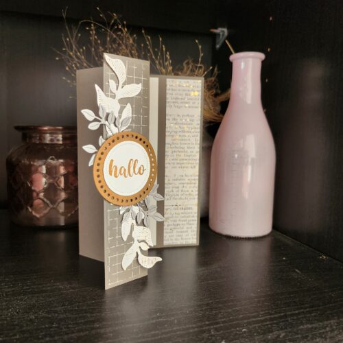 Het prachtige papier (DSP 12″x 12″) “Heerlijk Natuurlijk” is gelukkig meegegaan in het nieuwe jaar van Stampin’ Up!, dus goed verkrijgbaar. Het is prachtig met de goudaccenten.