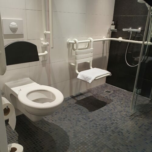 De kamer is ruim, badkamer ook. Ik moest nodig plassen maar nam bijna de verkeerde zit, alweer een lachsalvo….