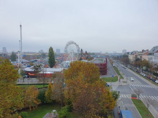 We hadden een taxi besteld en zochten deze bij de uitgang, maar na een uur wachten was de chauffeur blij met ons telefoontje. Hij stond een verdieping hoger…wisten wij veel. We zoeften langs de Donau door Wenen richting Prater, naar ons hotel. We hebben een pratig uitzicht op het Prater.