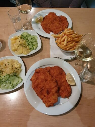 Een eettentje trok de aandacht en binnen was na wat moeite nog “Platz für zwei”. En wat bestel je dan? Natuurlijk een heerlijke Wiener schnitzel met Kartoffel-Gurkensalat. Und bitte noch ein Pommes Frites dazu. Nur eine Portion bitte… Danke!